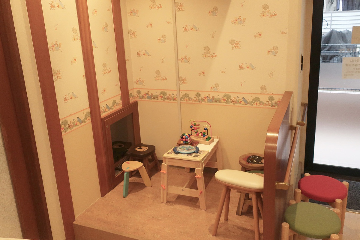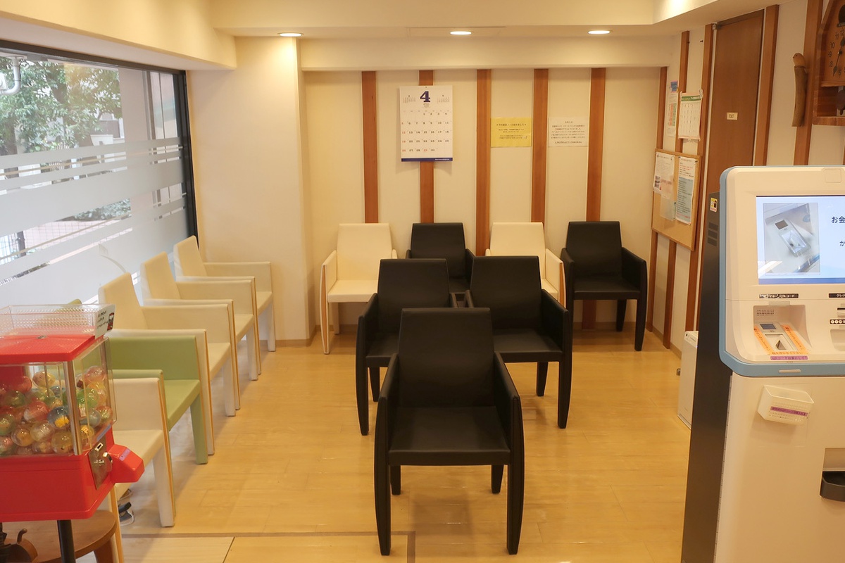 上の医院外観の右奥が受付です。駐車場はありません。自転車やバイクは左手看板前に広いスペースがありますのでそちらに駐輪して下さい。来院された患者さんの緊張が少しでも和らぐようにと外からの光が差し込む明るい待合室です。またプレイコーナーもあり、子ども向けのビデオ等が見られるようになっていますのでお子様連れでも安心してお待ちいただけます。