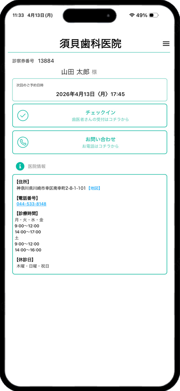 スマートフォンにによるモバイル診察券を導入しており、カードの診察券なしで予約の管理ができるようになっていてこちらをお薦めしています。お子さんを含めたご家族の予約を一括で管理したり、予約の変更をした際にも新しい予約日時が反映されるようになっています。