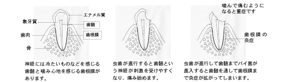 一般の方が神経と呼ぶものがこれで専門的には歯 髄と呼ばれています。この歯の中にある神経は冷たいもや熱いものを痛みとして感 じます。また虫歯が進行してバイ菌が入り込んで来たときにも痛みを感じ、ひどい 場合には神経を取る必要がでてきます。この歯髄という神経の中には血液が流れて いて歯全体に栄養を送っています。そのため神経(歯髄)のある歯は生きている歯、 神経(歯髄)の無い歯は死んでる歯と考えられ、生きてる木と枯れ木に例えられま す。神経(歯髄)を失った歯は弱く割れやすくなり、色も悪くなってしまいます。 歯にとって決して良いことではありません。自分で歯に穴が空いてしまったことに 気づいた時はもうすでに神経(歯髄)に近づいてしまっていることが多いようです。 神経を取ってしまえば痛まないで済むというのはあまり良い考えではありません。 神経が無くなってしまうと、虫歯が進行しても気づかず、抜歯しなければならい程 悪くしてしまうことがあります。
