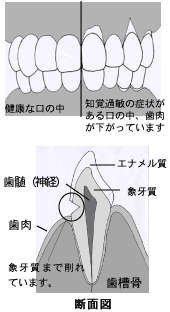 最近冷たいものがしみたり、歯ブラシが当たるとチクチクすることありませんか? なんでもない歯でも時々しみることはありますが、知覚過敏になっている可能性もあ ります。歯がしみるのは歯の中に歯髄(一般に神経と呼ばれるもの)があるためです。 神経は歯根の先の小さな穴から歯の中の象牙質に細かな枝をだして栄養を送る働きを しています。歯を削ったり虫歯がひどくなると痛みがでるのは神経があるためです。 通常象牙質は硬いエナメル質や歯肉に覆われていて、冷たい水や歯ブラシなどの刺 激では痛むことはありませんが、虫歯がエナメル質の中まで進んだり強いブラッシン グや歯槽膿漏で歯肉が下がって象牙質が露出すると歯ブラシで少しずつ削れてしまい 神経に近くなってしみたり痛みがでたりします。固いものが好きな人や、歯ぎしりを する人は根本の象牙質がはがれたり欠けたりしてしみることもあります。