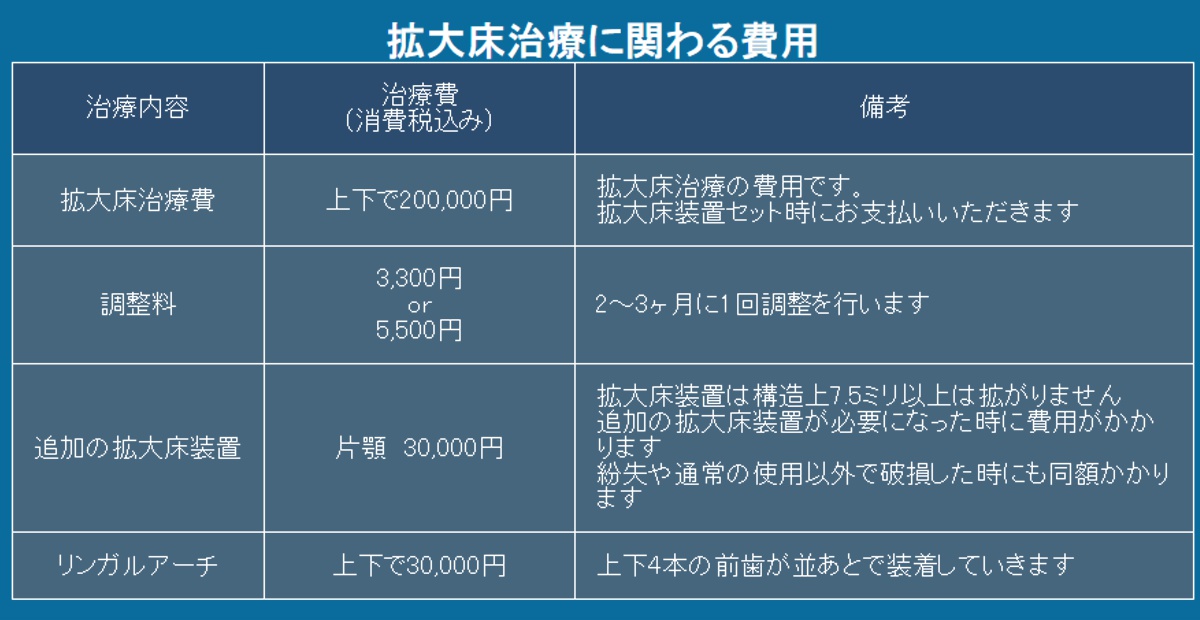 拡大床治療に使用する装置の装着時に170,000円の費用がかかります。その後の調整費はⅠ回3,000円から5,000円程度かかります。むし歯治療や口腔機能訓練などは保険診療でカバーされますのでそれらの治療が必要な時は保険診療となります。拡大床治療だけですべてがキレイになるわけではないので別の矯正治療が必要になった場合は別料金になります、おおよその治療費は別表のようになります。 歯ならびの相談で矯正専門の歯科医院に行かれた方はもっと高額の治療費の提示があったと思いますが、治療の目的や目標が異なりますので治療費だけを比較して医院を選択することはお勧めできません。矯正治療では短期間で集中的に治療が行われることが多いので、お子さんに完璧を求めるご家庭や治療期間に制限のあるかたは矯正歯科専門の医院を受診されることをお勧めします。