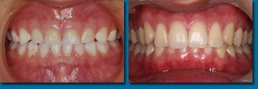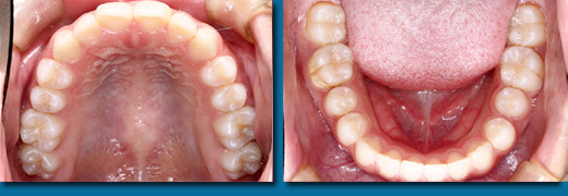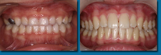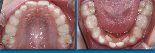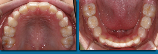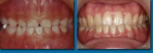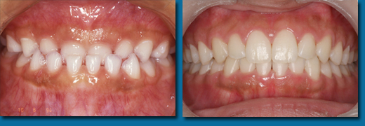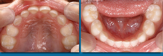 歯並びが悪くなってから治療することを歯列矯正といいますが、乳歯の頃から出てくる歯並びが悪くなる兆候を早期に発見しそれを改善しながらきれいな歯並びの永久歯にしていくことを咬合育成といいます。専門的には歯列矯正と咬合育成は別の物と区別されています。咬合育成は歯並びの予防と考えられ当医院では積極的に取り組み、多くの歯並びの良い子供が育っています。写真の左は乳歯の時、右が永久歯になった時のものです。