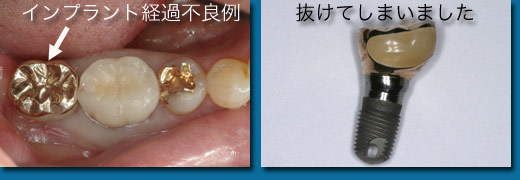 今までは部分入れ歯しか考えられなかった口の中にインプラントを使って歯を入れられるようになりました。取り外しでなく歯ごたえのある物もしっかり噛めるようになるのでインプラントを入れた患者さんの満足度はとても高いものがあります。しかしインプラントも万能ではありません。今まで歯を失った方にはその原因となる何かがお口の中には潜んでおり、それがなければ歯を失わなかったはずです。その原因には色々とありますが専門的な立場から見てインプラントに適さない場合もあり、経過が思わしくなく残念なことに抜けてしまうこともあります。インプラントの過剰広告に惑わされることなく慎重に治療方法を選択する必要があります。