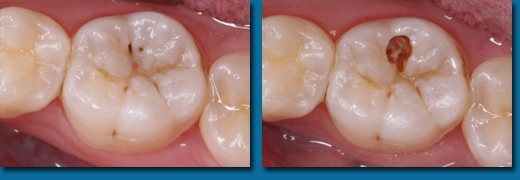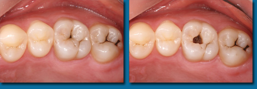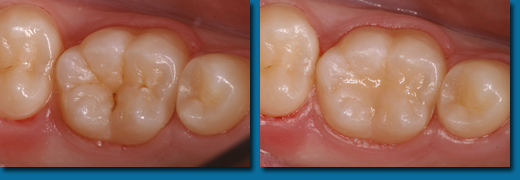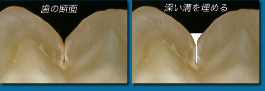 子供の出てきたばかりの歯は溝が深く虫歯になりやすい状態にあります。深い溝に接着力のある樹脂を流し込んで虫歯にならないようにすることをシーラントといいます。溝の深さには個人差がありますがリスクの高い歯には積極的にシーラントを行います。