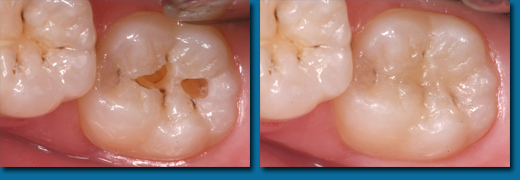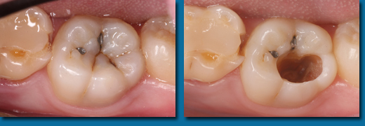 専門的にはう蝕診断といいますが一般の方が思うほど簡単なものではなく、集団検診でも歯科医院でも見逃されることが多くあります。写真の歯はいままで虫歯ではないと言われていましたが冷たいものがしみたり痛みがあったそうです。当院で調べてみると大きな虫歯が中で拡がっていることがわかりました。虫歯の入り口は小さくても中で大きく拡がっていることが多くあります。色々な診査器材を使用して虫歯も虫歯になりやすい歯も見逃しません。