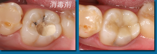 虫歯の犯人はお砂糖を吸収して歯を溶かす酸を出すバイ菌です。バイ菌を取り除くことが虫歯治療の第一歩です。小さい虫歯ではバイ菌の入ってしまった部分を削り取り即日に治療を完了しますが大きな虫歯ではそれができません。そのため消毒・殺菌によってバイ菌を除去します。当院では自然界にあるタンニン・フッ素を含む薬剤を使った消毒を行います。完全に消毒ができ歯の硬さが戻ってくるまでに数ヶ月から数年かかることもありますが再発させないためには重要なステップです。
