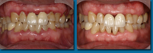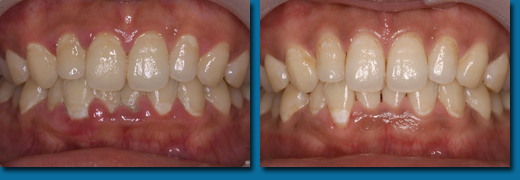 歯の磨き方が悪いと虫歯にもなりますが、磨き残した歯垢が唾液と反応して硬い歯石になって歯にこびり付いてしまいます。歯石になると歯ブラシでは取れなくなり、その中には沢山のバイ菌が潜んでいるために周りの歯肉が赤く腫れてしまいます。歯ブラシがあたると出血しやすくなりそのまま放置すると歯槽のう漏に進行していきます。歯石の除去を行い毎日の歯磨きをしっかり行うことで歯肉の状態はビックリするぐらい良くなります。歯石の除去は歯科衛生士の上手い下手が最も出る部分で、当院の歯科衛生士も歯石の取り残しがないように日々努力しています。左が歯石を取る前、右が取った後です。