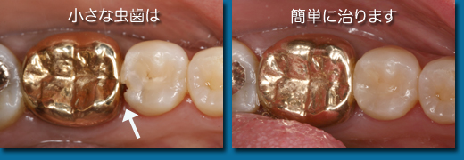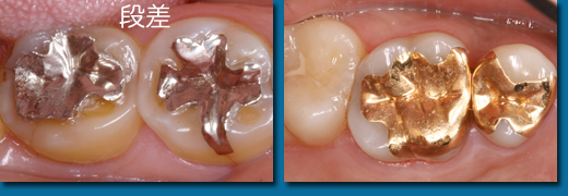虫歯を削ったところに詰める材料にはいろいろあります。小さい虫歯はコンポジットレジンという硬いプラスチックで埋めますが歯と同じ色で治療も一回で済みます。大きなものでは強度が必要となり金属かセラミックを使用します。保険で使用する銀色の金銀パラジウム合金は硬すぎて使っていくうちに周りの歯との間に段差が出てきます。ゴールド系の金属は柔らかいので段差がでにくいのが特徴です。セラミック系のものはきれいですが割れやすいのが難点です。小さな虫歯のうちに治しておくのが得策です。