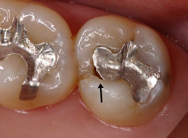 歯にものがはさまるという患者さんの写真です。歯の一部が欠けてしまい金属との間に隙間ができているのがはっきりわかります。素人の患者さんが見ても治療が必要であることがわかると思います