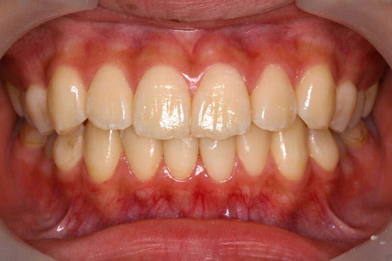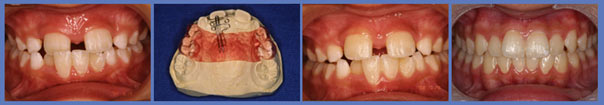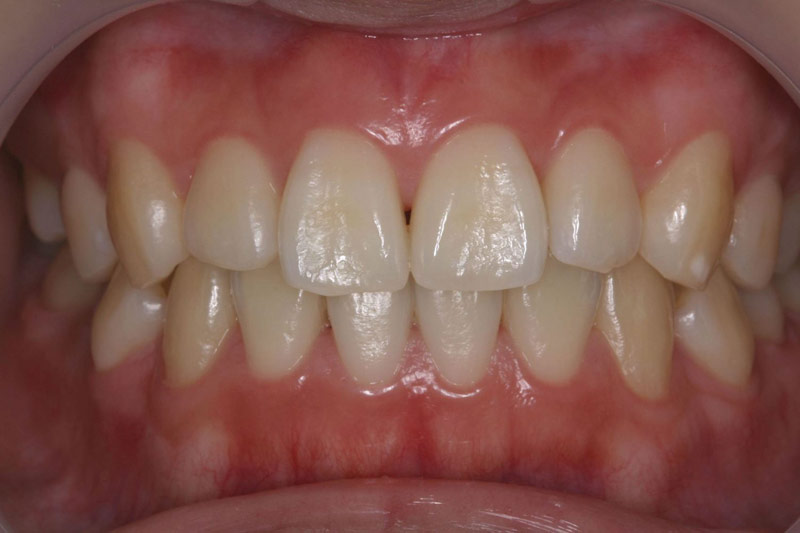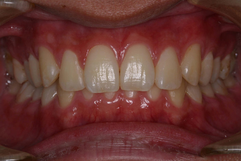 上の前歯は下の前歯より前にないといけませんが、前歯の生え替わりの時に1本逆に生えてきました。そのままではきれいな歯並びにはなりそうもありません。この時が治療のタイミングです。簡単な矯正装置で改善しただけでその後きれいな永久歯列になりました。