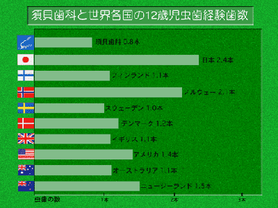 須貝歯科医院には小児の患者さんが多く来院していますがほとんどが虫歯の予防と歯ならび管理の患者さんで虫歯の治療が必要な場合は稀です。4カ月ごとの定期健診を小さい頃から受けることによって虫歯の予防ができ永久歯列が完成する12才時の一人虫歯経験歯数の平均は約0.8本で世界一のスウェーデンより高い水準になっています。