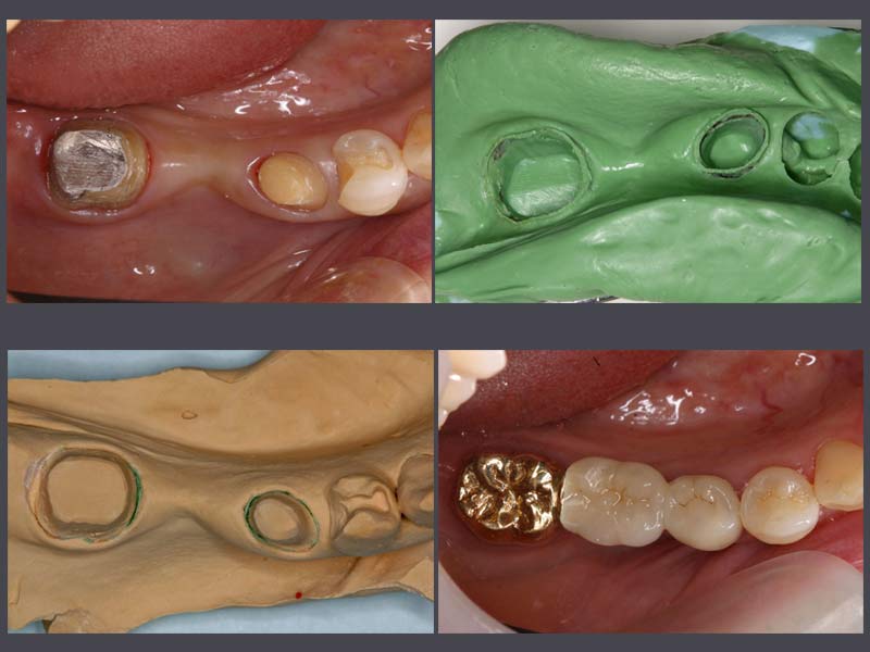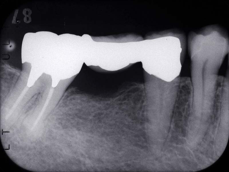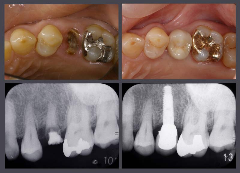 保存不可能な歯根を抜いてその日のうちにインプラントを入れたケースです。従来であれば前後の歯を削ってブリッジにしなければならないケースですがイン プラントを使えば前後の歯にダメージを与えることなく歯を入れることができます。