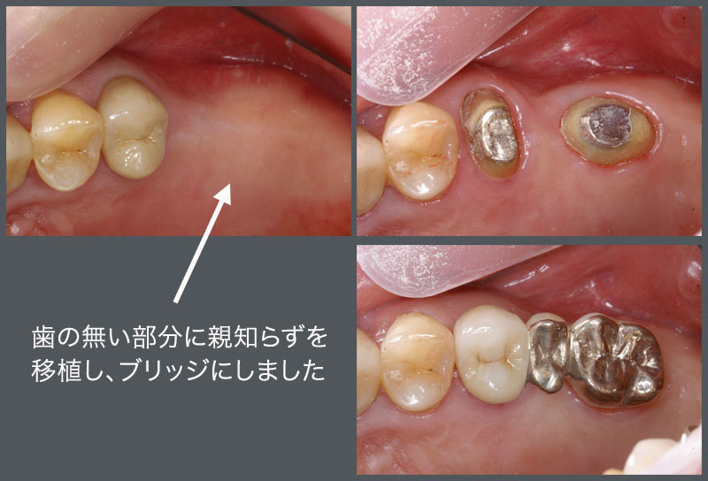 歯が無くなってしまったところに噛み合わせに関係のない親知らずなどを移植することが出来ます。20年以上前からある方法ですが未だに一般的ではなく手掛ける歯科医も知っている患者さんも少ないのが現状です。しかし自分の歯であれば問題なく他の場所で元からそこにあったように機能させることができ、沢山の良好な経過がでてきています。インプラントを考えるのと同時に自分の歯を移植できるかどうかを考える必要があります。移植できるケースとできないケースとがありますが、親知らずであっても自分の歯を一本でも有効に使うことが大切であると考えています。