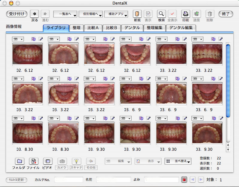 須貝歯科医院では患者さんのお口の中の写真を撮り、説明や経過観察に役立てています。手鏡で口の中を見せられ説明されてもなかなかわからないものですが、写真を見ればすぐわかるものも多くあります。またメインテナンス時に患者さんが来院し不調を訴えられたときに以前の写真があればどこが変化したのかがわかりやすくなります。何年かぶりに来院した患者さんの写真を見比べてあまりの変化にお互いびっくりすることもあります。