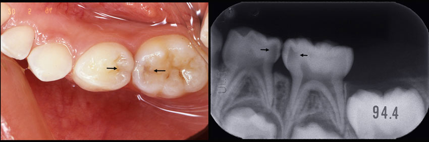 一見何でもなさそうですがレントゲンでは大きな虫歯が確認できます。鮮明なレントゲンであれば素人の患者さんにも虫歯であることがわかります。