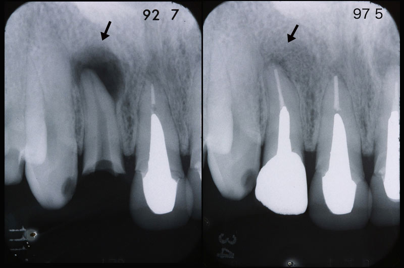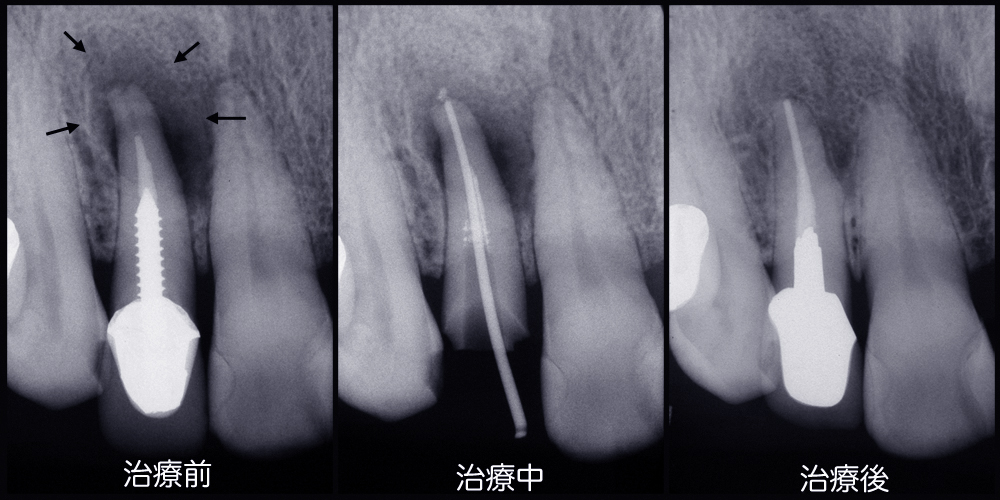 上のレントゲンでは根の先端に大きな病巣があるのがわかります。右側が治療後ですが病巣が消えています。歯を入れるだけでなくレントゲンで骨の状態の改善が確認できなければ本当に治ったとは言えません。