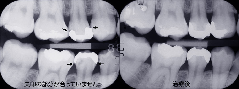 入れた歯の噛み合わせがおかしい、物がよくはさまる、糸楊枝が引っかかるなどの経験をしたことのある方も多いと思います。これは金属の被せ物や詰め物の精度の問題です。下の左右のレントゲン写真を比べてみましょう。レントゲンの中で白く抜けているのは金属の詰め物です。左側のレントゲンの詰め物は自分の歯と合っていないのがわかります。治療後の右側レントゲンの詰め物は歯とピッタリ合っているように見えます。糸楊枝を入れてもどこも引っかかりませんし違和感もありません。いつもこのように製作することが理想ですがそのためには衛生士が歯と歯肉をきれいにし、歯科医がきれいに歯を削り、歯形を取り、技工士が丁寧に補綴物を製作というすべてのステップをしっかり行うことが必要です。コストも労力もかかることですが須貝歯科医院ではすべてを院内で行うことで精度の高い物を作るように努力しています。残念なことですが現在の保険診療では完全な赤字部門で院内で賄うことで何とか頑張っています。保険で使用できる金属があまり良い物ではないこともあり、できるだけ保険外の適切な材料を使用して被せ物や詰め物を作っていただけるように患者さんにはお願いしています。