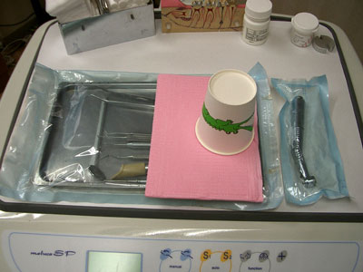 患者さんに使用する基本セット。エプロン、うがい用コップは使い捨て。歯を削るタービンは患者さんごとに滅菌されたものを使用しています。