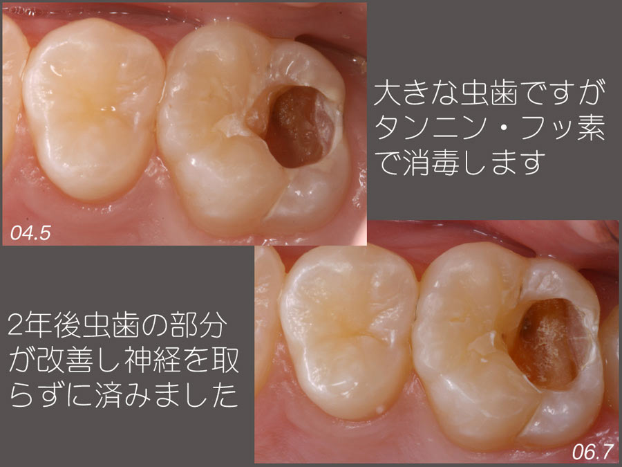 虫歯があまり進行して歯が痛くなると歯の神経を取ることがあります。歯の神経は歯に栄養を送っており神経を取ることによって歯は枯れ木と同じようになってしまいます。須貝歯科医院ではなるべく神経を取らない治療をおこなっています。虫歯の治療には段階的除去法といって、一回で虫歯のすべてを取り除くのでなく薬で虫歯のばい菌を殺菌しながら改善できない部分だけを取り除いていく方法があります。マスコミでは3mix法という抗菌剤を用いた治療方法が取り上げられていますが須貝歯科医院ではタンニンという食物由来のお茶やワイン、柿などに含まれる収斂剤とフッ素が配合されたHY剤という薬剤を使用して同様の効果を上げています。完全に治療が終わるまでに数年かかることもありますが痛みもなく神経を残すことのできる治療法です。